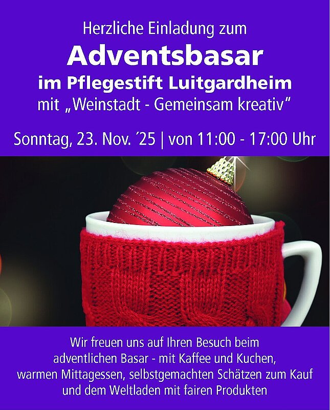 wir laden Sie herzlich ein zu unserem Adventsbasar zusammen mit der Gruppe "Weinstadt - Gemeinsam kreativ" und freuen uns auf Ihren Besuch im Pflegestift Luitgardheim
