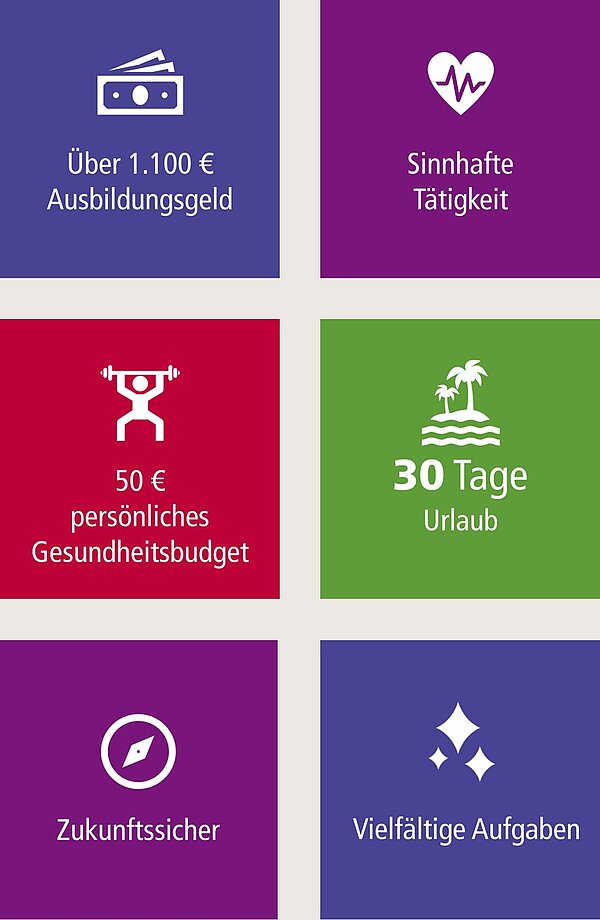 Die Ausbildung dauert 3 Jahre. Nach Abschluss bist Du "Staatlich anerkannte/-r Familienpfleger/-in". Im ersten Ausbildungsjahr erhältst Du bereits 1.415€ Ausbildungsgeld. Die Tätigkeit als Familienpfleger/-in wird nach AVR-WÜ vergütet. Das beinhaltet Zulagen für die Arbeit an Sonn-, oder Feiertagen, eine Jahressonderzahlung und eine extra Altersvorsorge. Durch unsere enge Zusammenarbeit zwischen Familienpflege und Ambulantem Dienst kannst du nach Abschluss auch anteilig in einer unserer Diakoniestationen tätig sein. Gerne unterstützen wir Dich bei Fort- und Weiterbildungen.