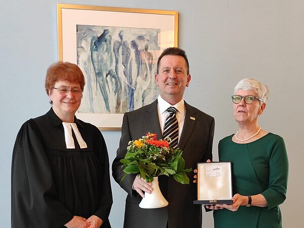 Zum 1. Januar 2023 wechselte Karsten Trezl vom Pflegestift Pforzheim zurück nach Birkenfeld. Hier zählen auch das Wohnstift und die Tagespflege zum neuen Verantwortungsbereich der Führungskraft. Dafür überreichte Etta Brumm symbolisch einen goldenen Schlüssel. "Karsten Trezl hat als Pflegedienstleitung im Pflegestift Pforzheim sehr gelungene Aufbauarbeit geleistet. Ich freue mich sehr darüber, meine Birkenfelder Aufgaben mit Blick auf den Ruhestand in seine Hände zu legen."