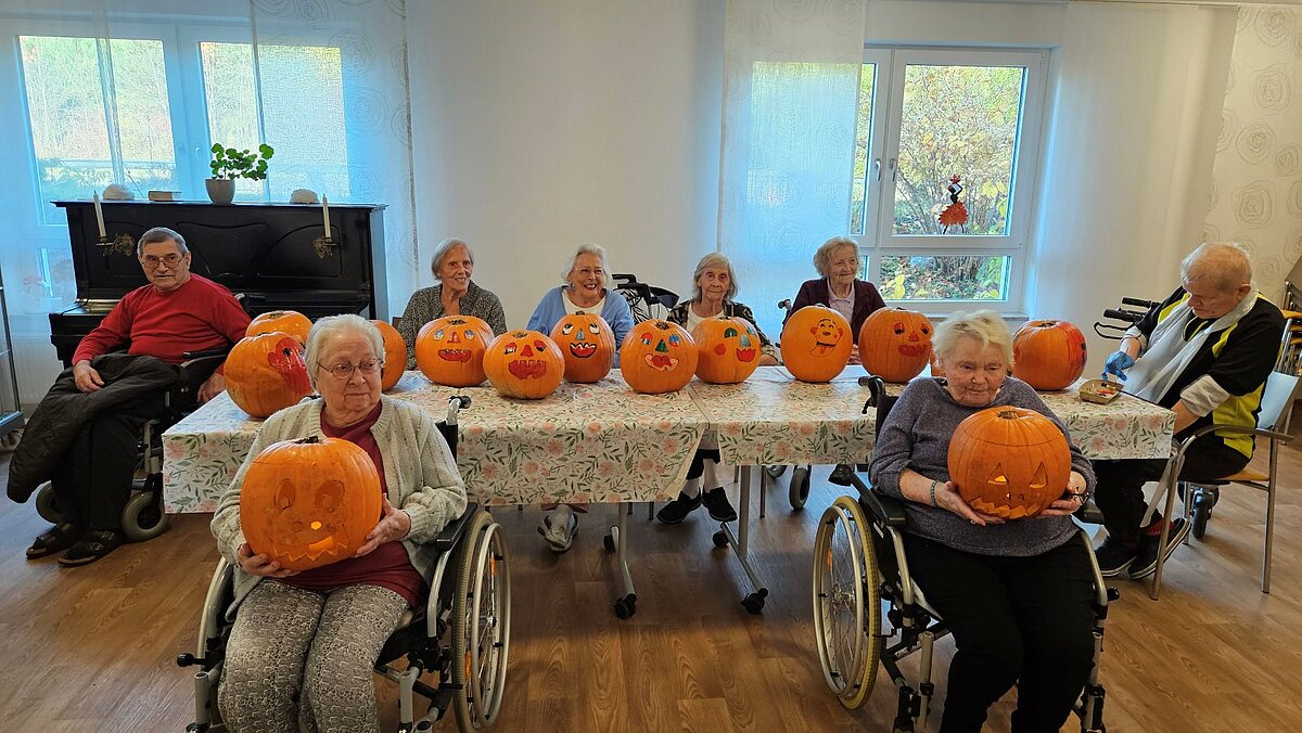 Das mag zwar aus Amerika kommen, aber unsere Bewohnenden ließen sich den Spaß nicht nehmen, es auch zu versuchen. Sie bemalten die Kürbisse, während die Betreuung sich daran machte, zwei weitere auszuhöhlen.