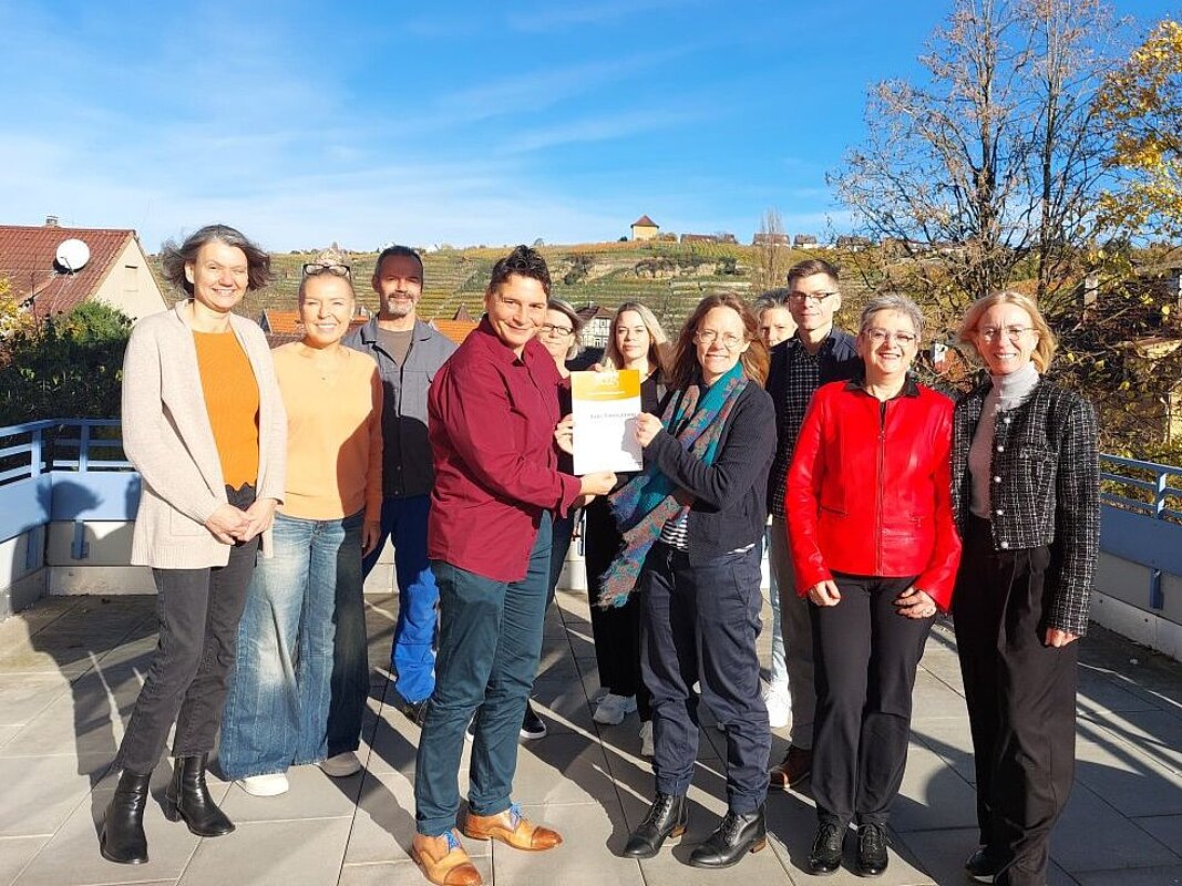 Bei strahlendem Sonnenschein und mit Blick auf die herbstlich gefärbten Weinberge durfte das Pflegestift Stuttgart-Münster stellvertretend das Siegel entgegennehmen.